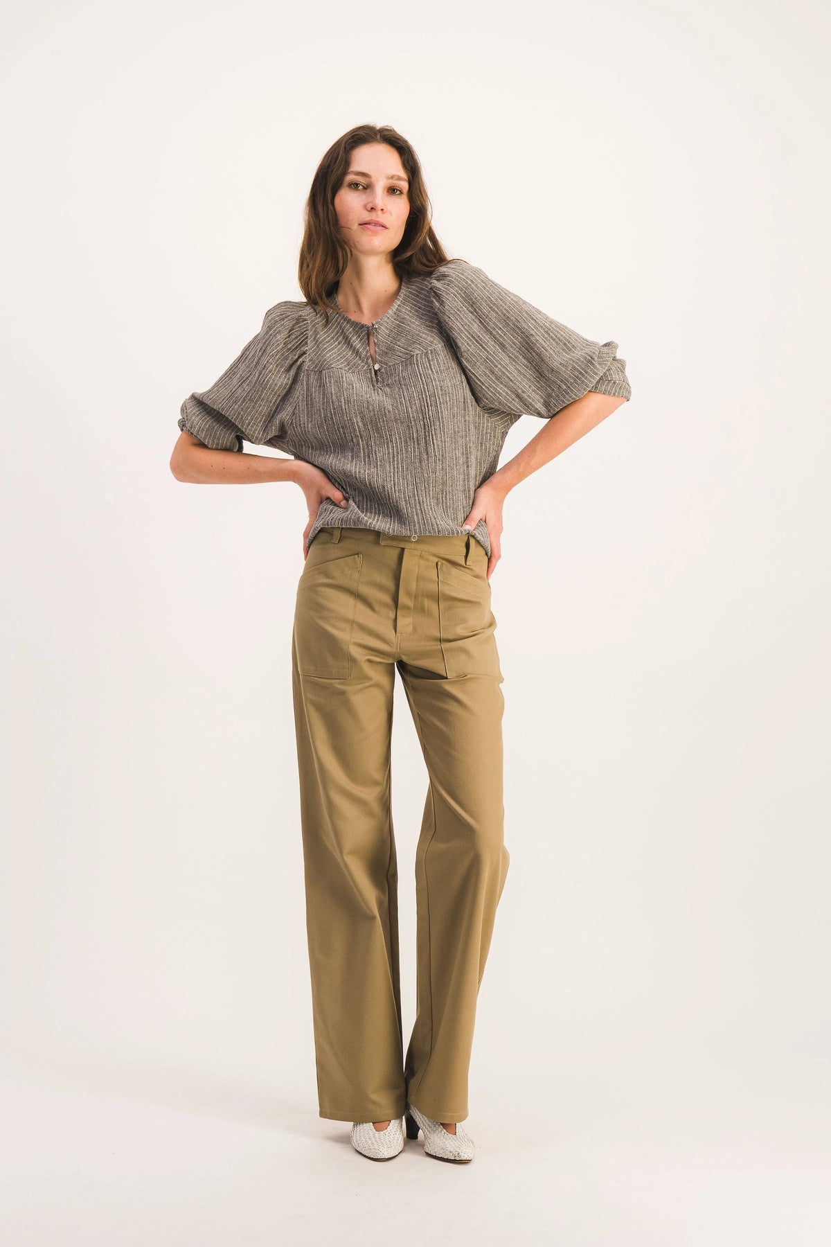Pantalón acampanado de cintura alta con dos bolsillos de parche (delantero y trasero). Tapeta de botones bajo la solapa delantera. Gabardina tejida en Francia, color exclusivo. Talla pequeña, corte entallado.