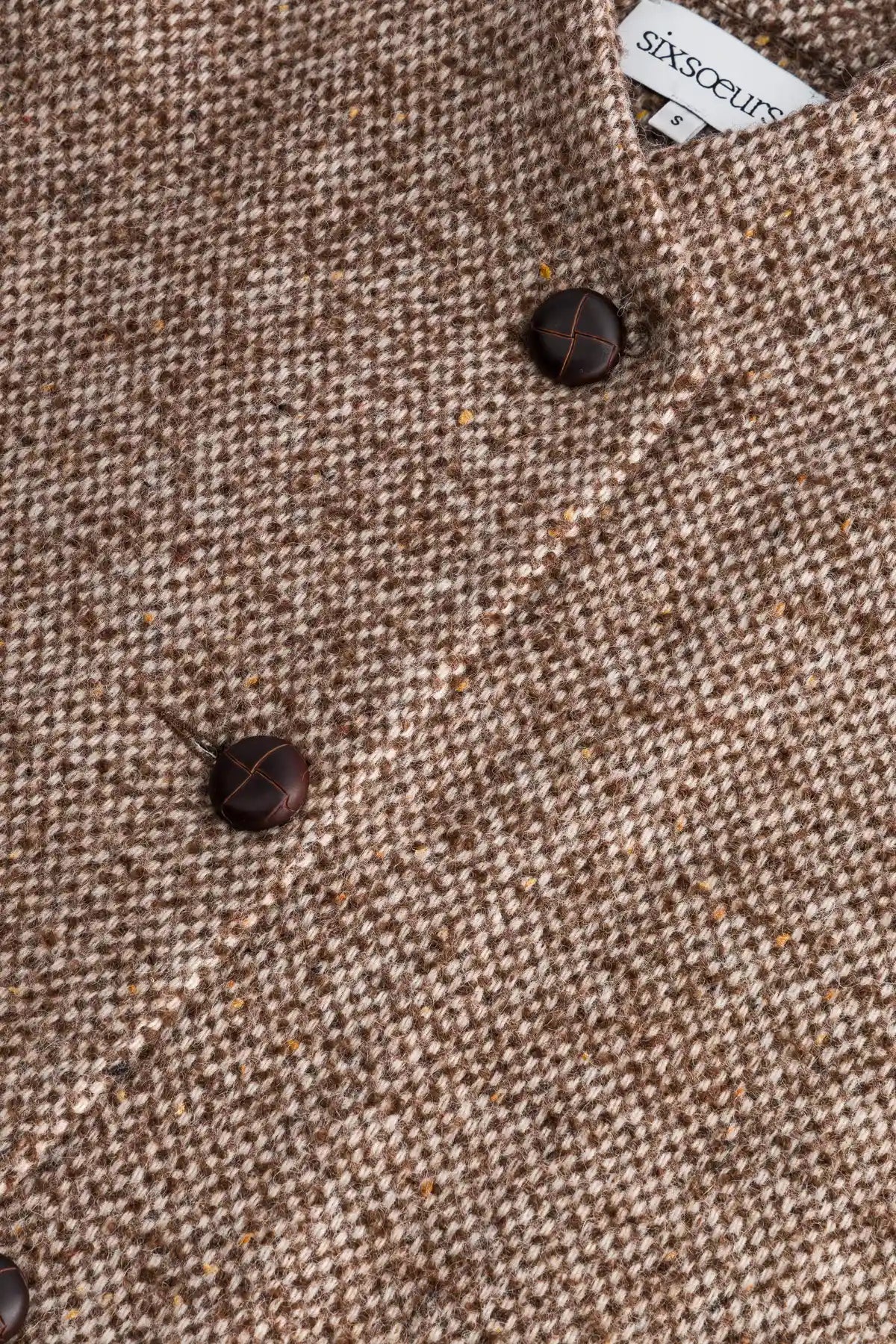 Chaqueta corta de lana marrón, de una lana preciosa. Tejido de cesta en Italia, color crudo praliné. Corte extragrande, mangas cortas, sin forro, como una pequeña capa, cuello integrado para un volumen refinado, dos bolsillos de parche y botones de fabricación francesa.