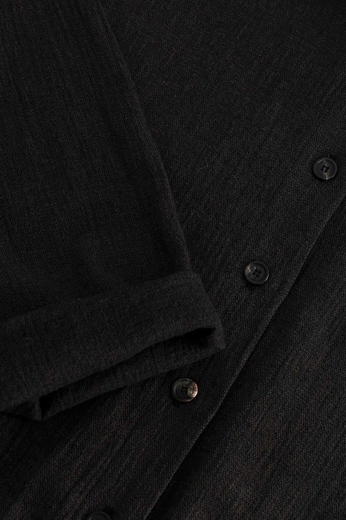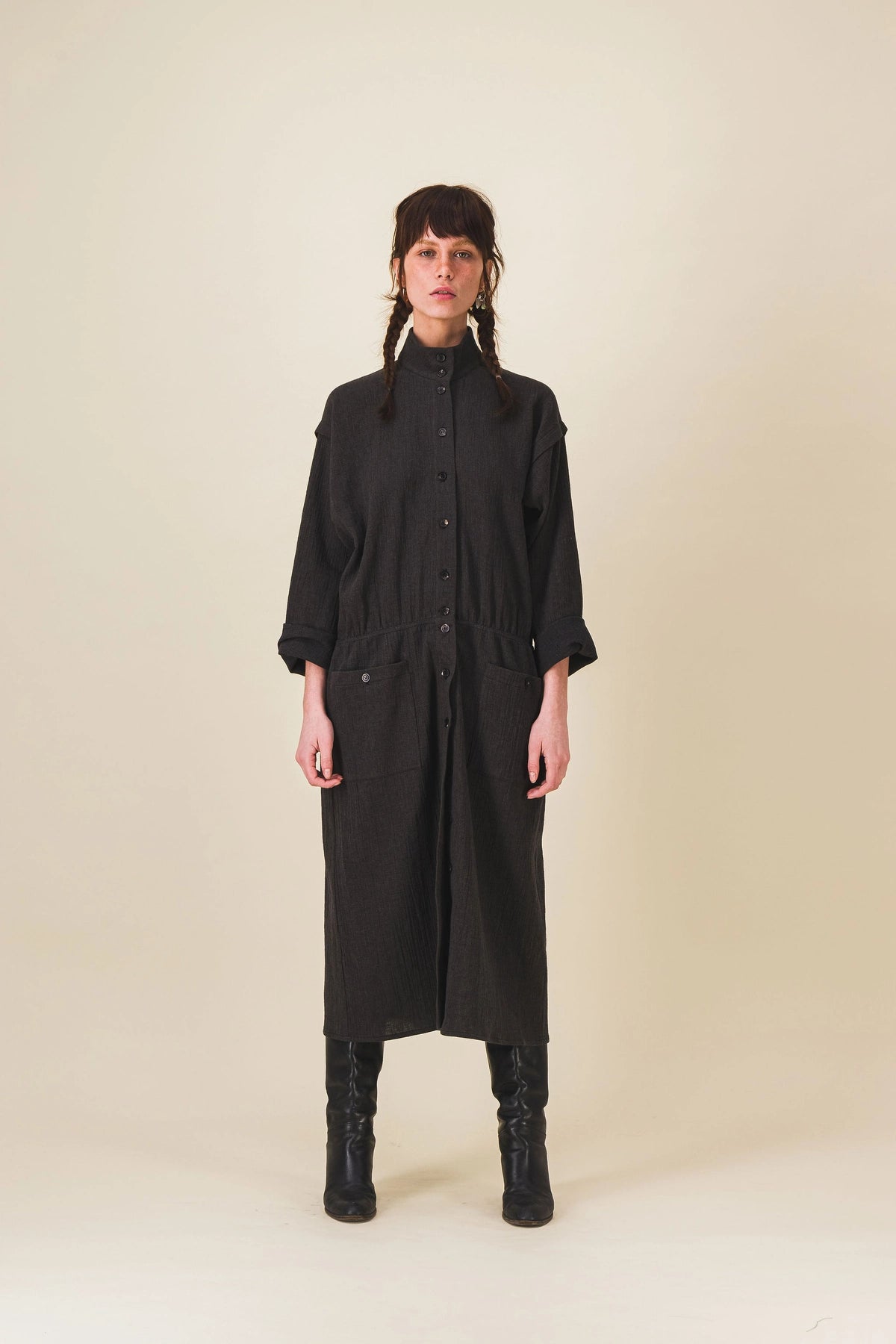Vestido largo de invierno de color negro, abotonado en la parte delantera, en tejido gris carbón jaspeado.