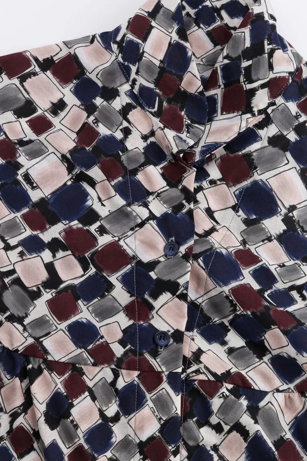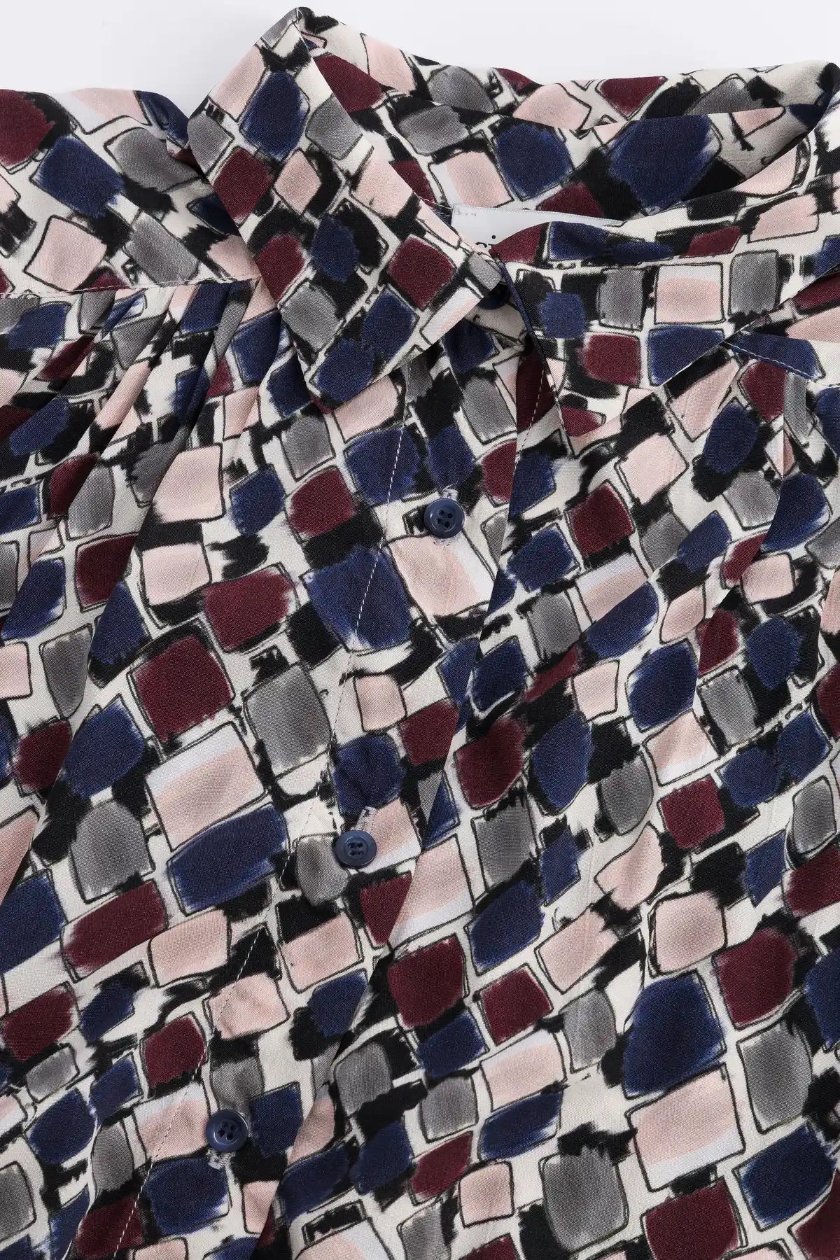 Blusa romántica y holgada con aires de los años 20, abotonada al frente. Presenta un canesú redondeado que se extiende hasta la mitad del hombro, cuello alto, pequeños frunces delanteros y aberturas laterales. Confeccionada en un exclusivo voile de algodón estampado.