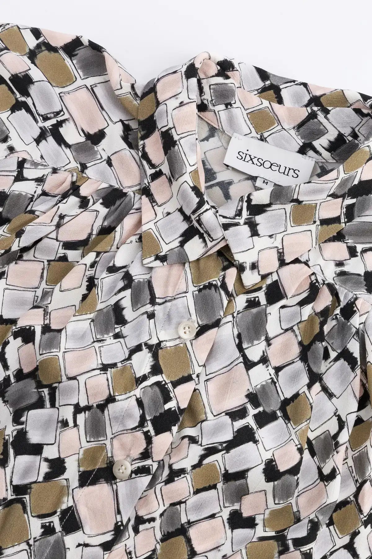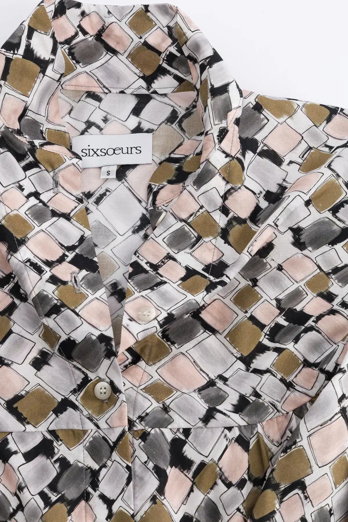 Blusa romántica y holgada con aires de los años 20, abotonada al frente. Presenta un canesú redondeado que se extiende hasta la mitad del hombro, cuello alto, pequeños frunces delanteros y aberturas laterales. Confeccionada en voile de algodón estampado exclusivo.