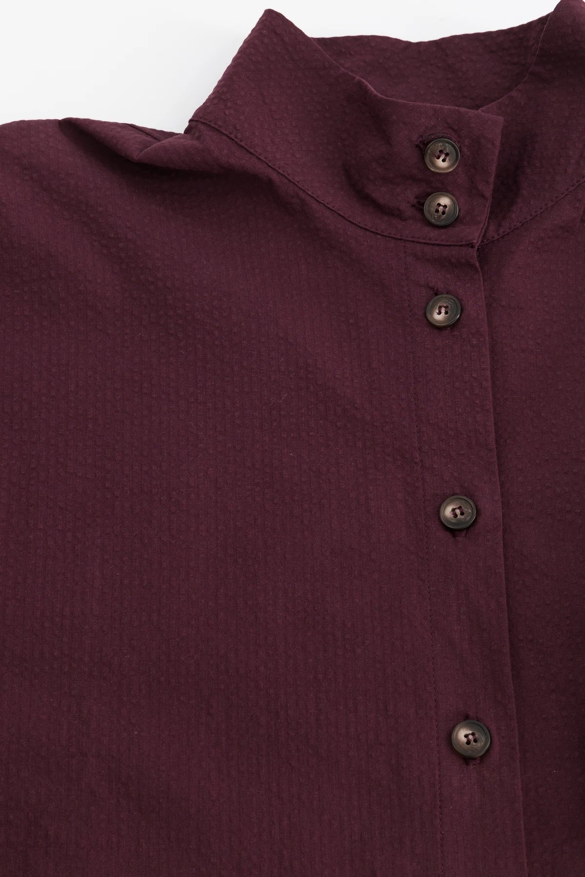 Camisa de cuello alto, abotonada al frente, mangas murciélago con detalles de rayas. Seersucker burdeos.