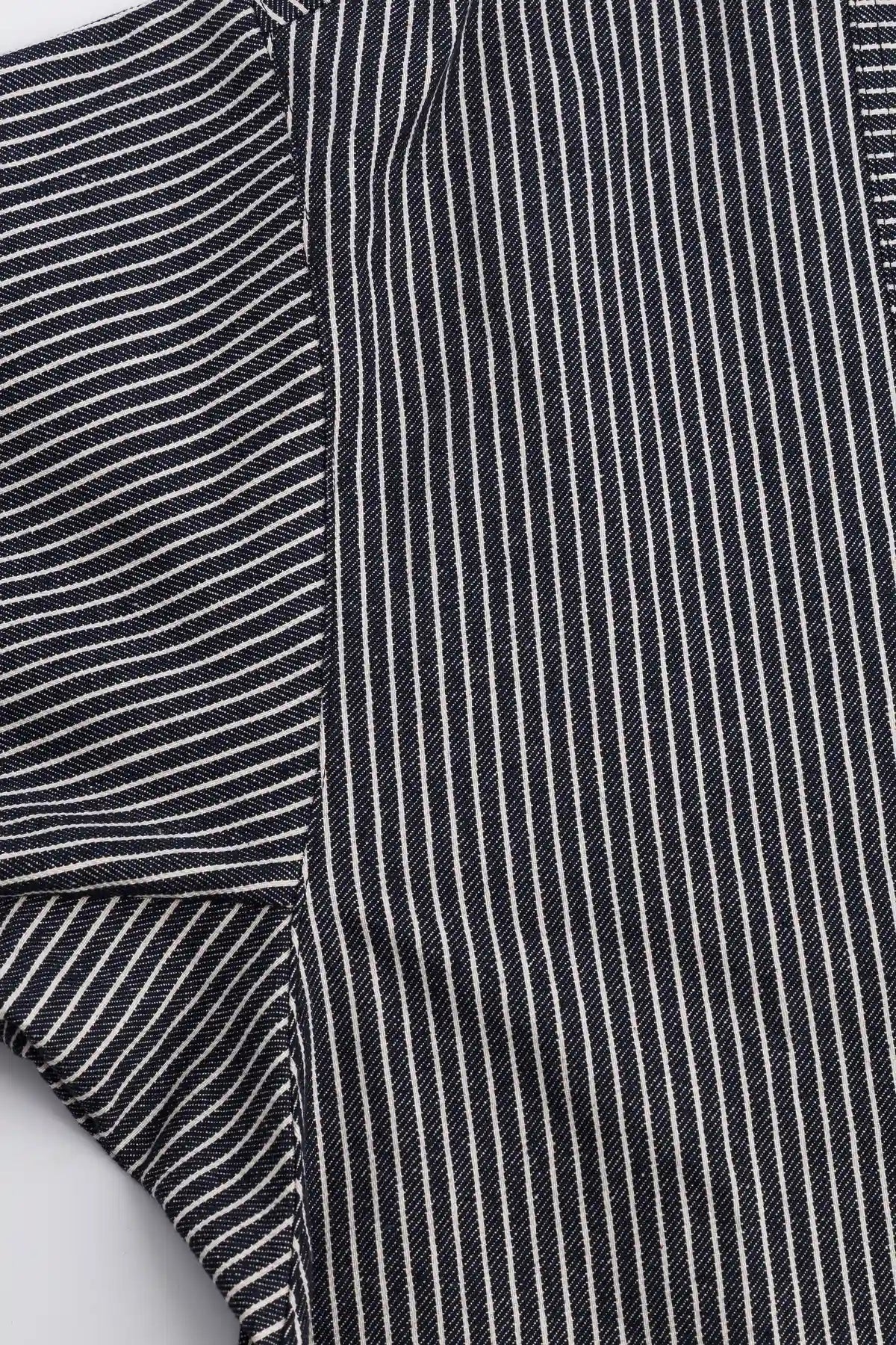 Chaqueta vaquera sin forro estilo Oshkosh. Perfecta para entretiempo. Corte recto, cierre a presión, mangas kimono con refuerzos, cuello alto y dos bolsillos de parche delanteros. Vaquero tejido en Francia.
