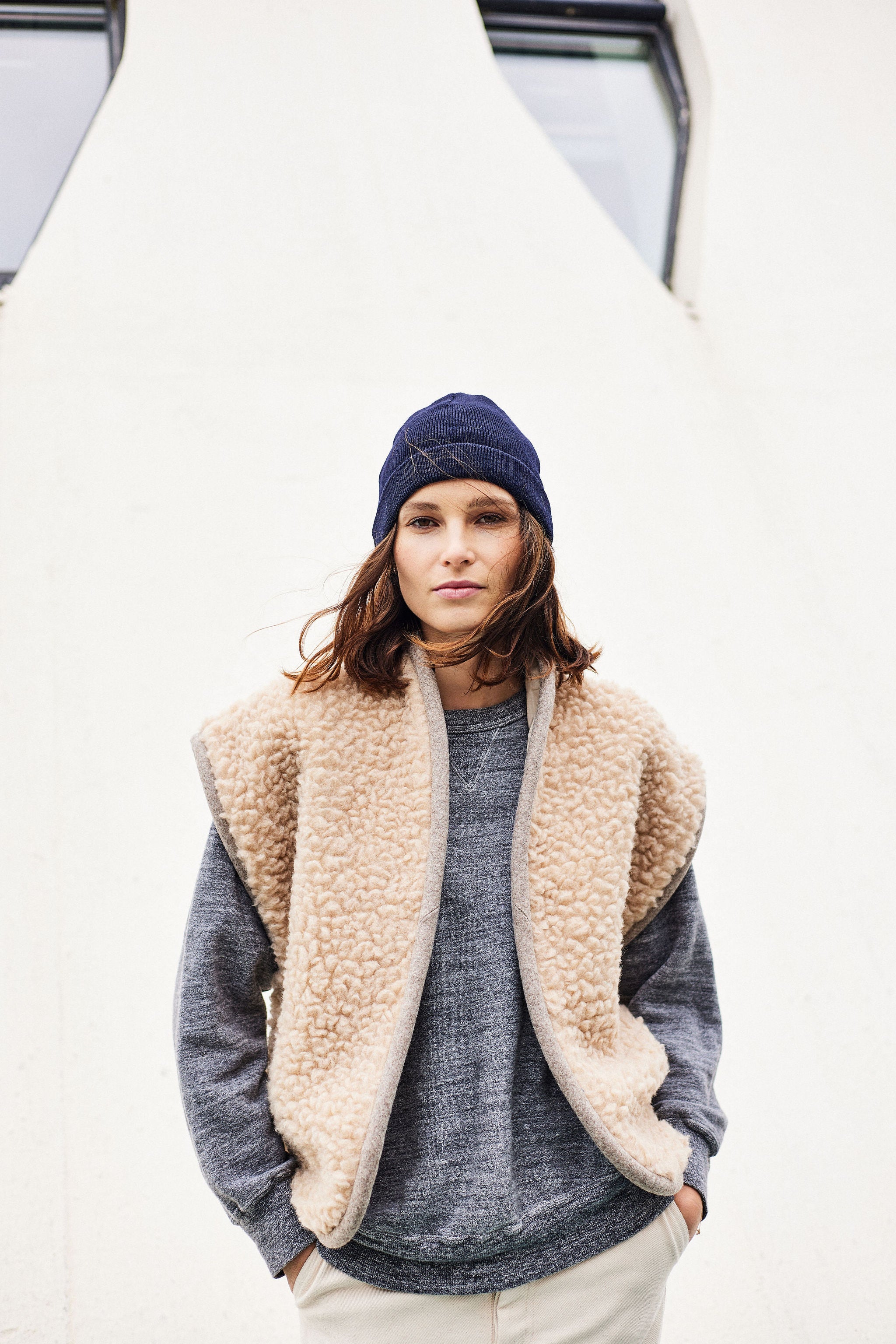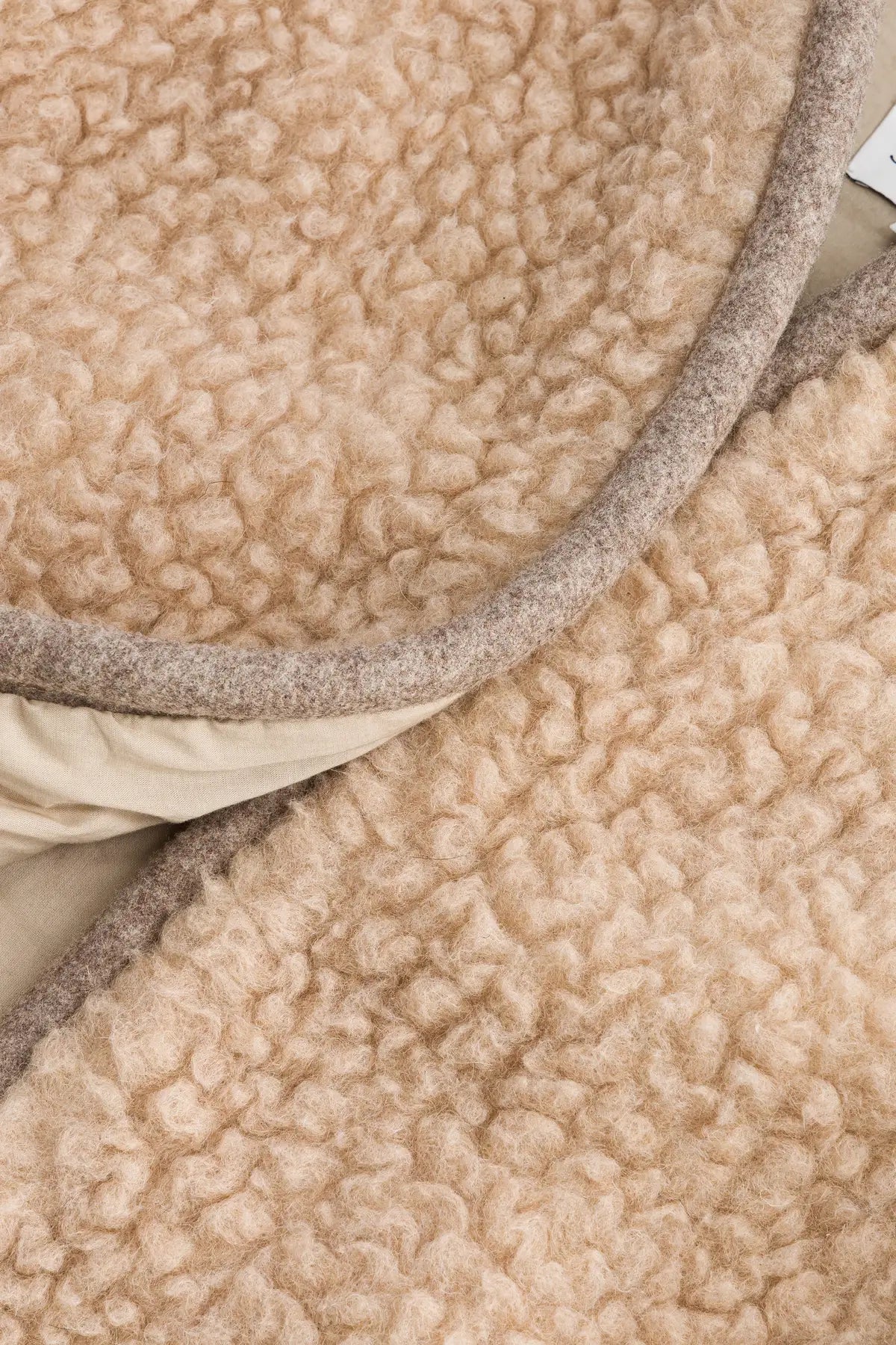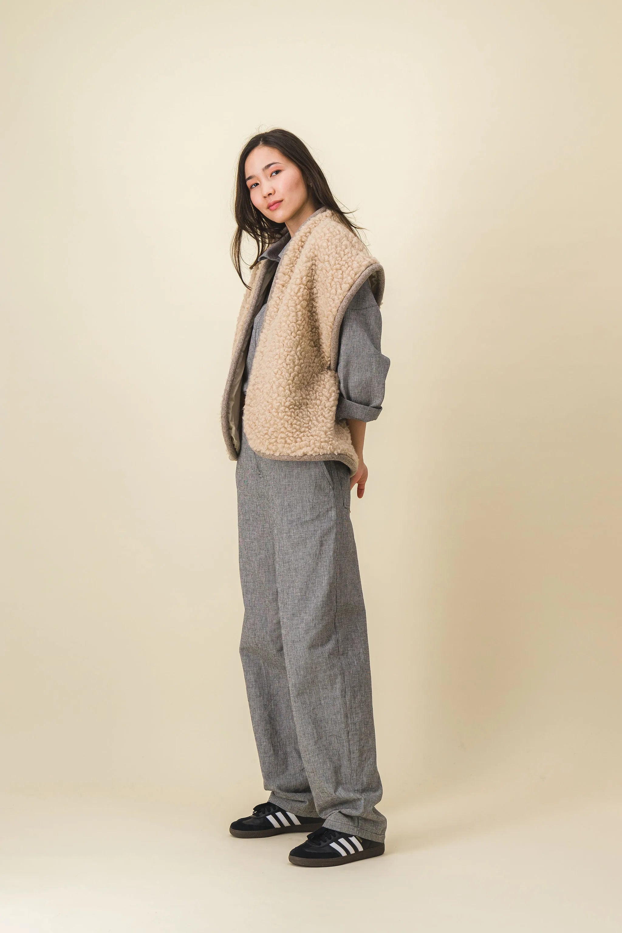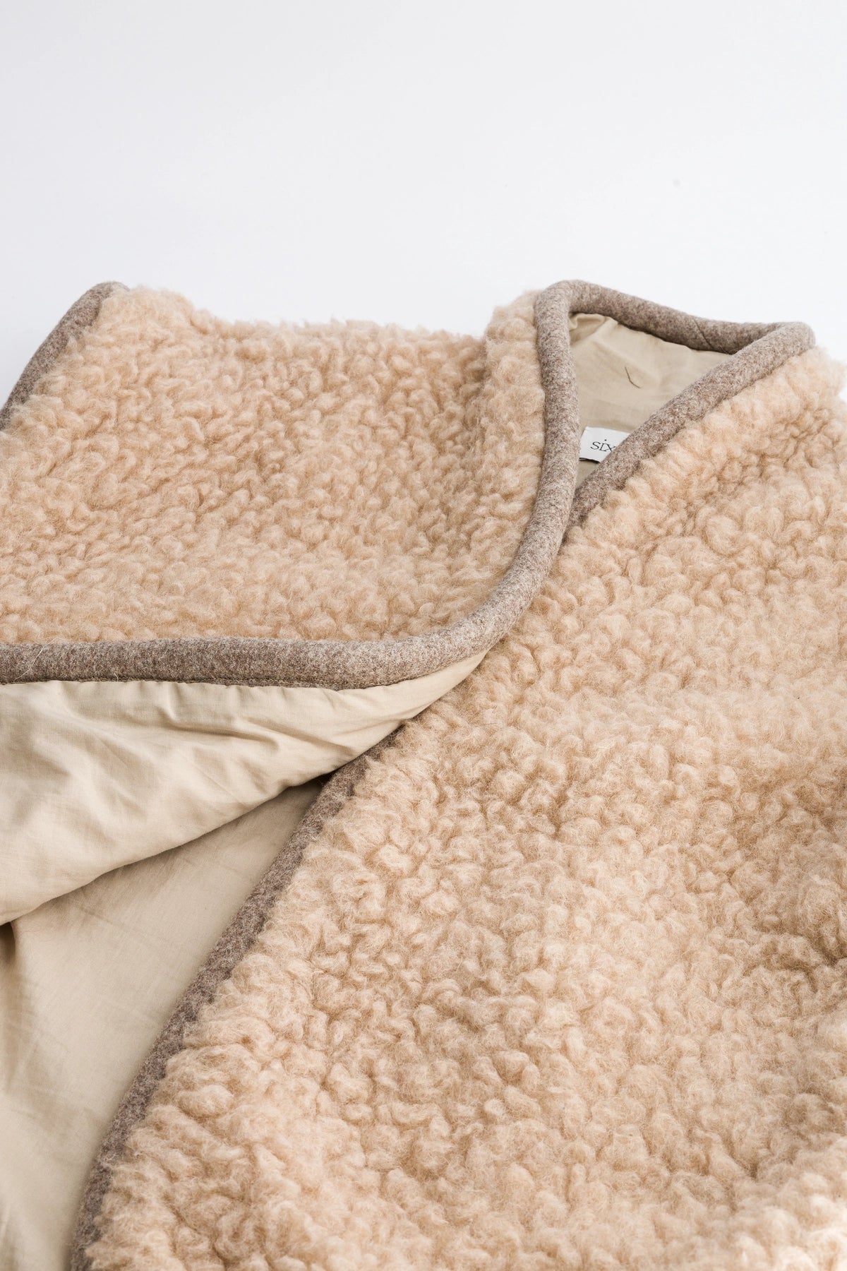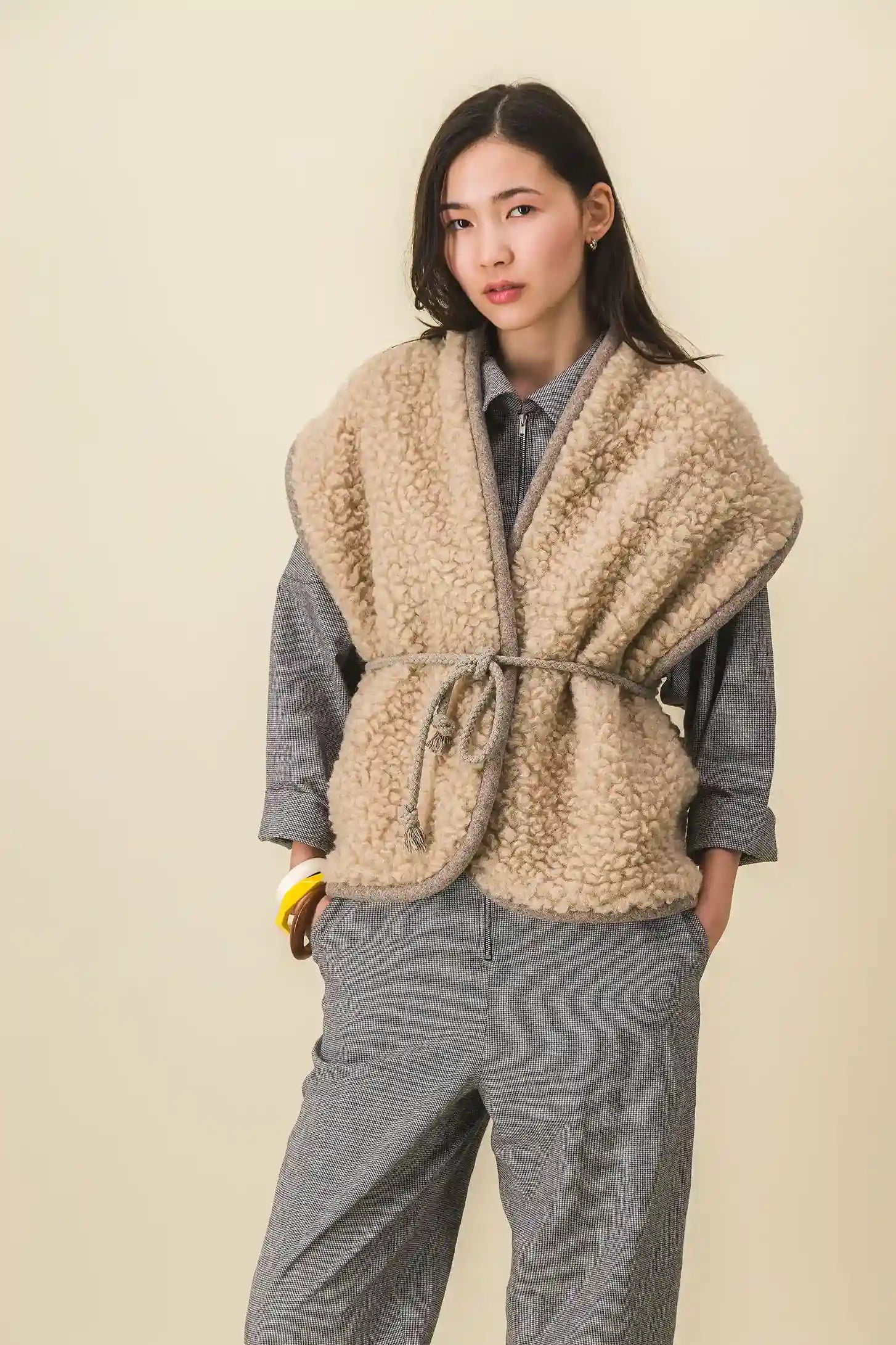 Chaqueta sin mangas de polar de lana beige. El bajo está ribeteado con un galón acolchado y recubierto de tejido de lana beige jaspeado.