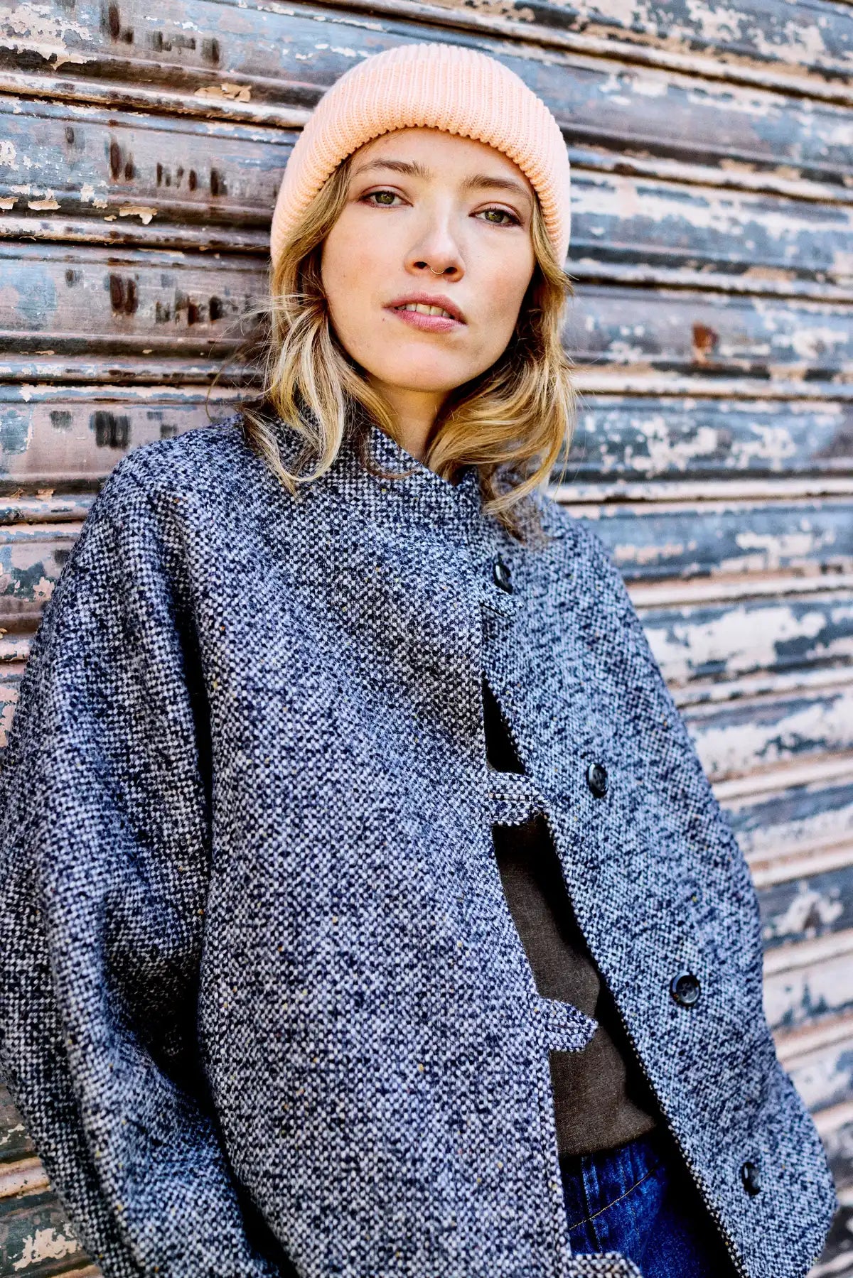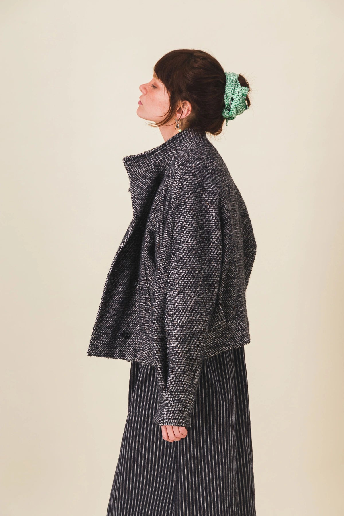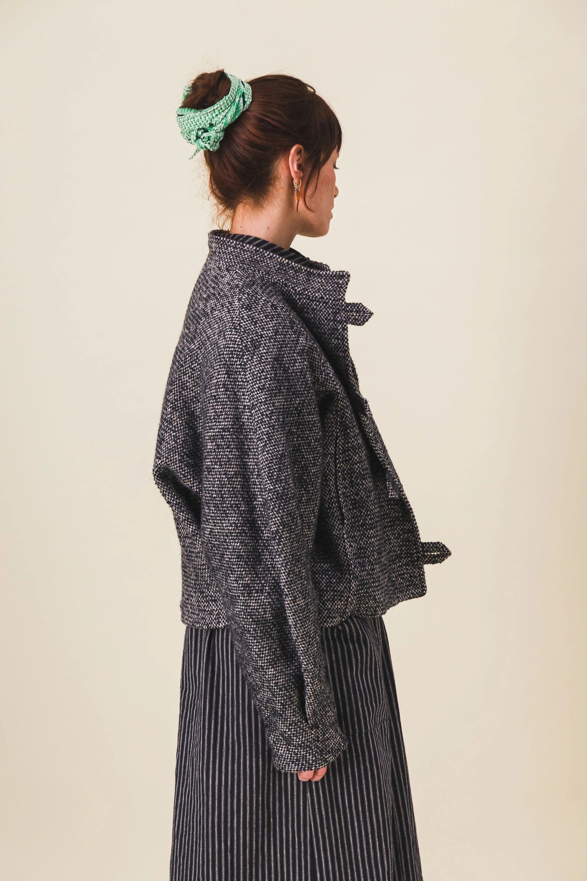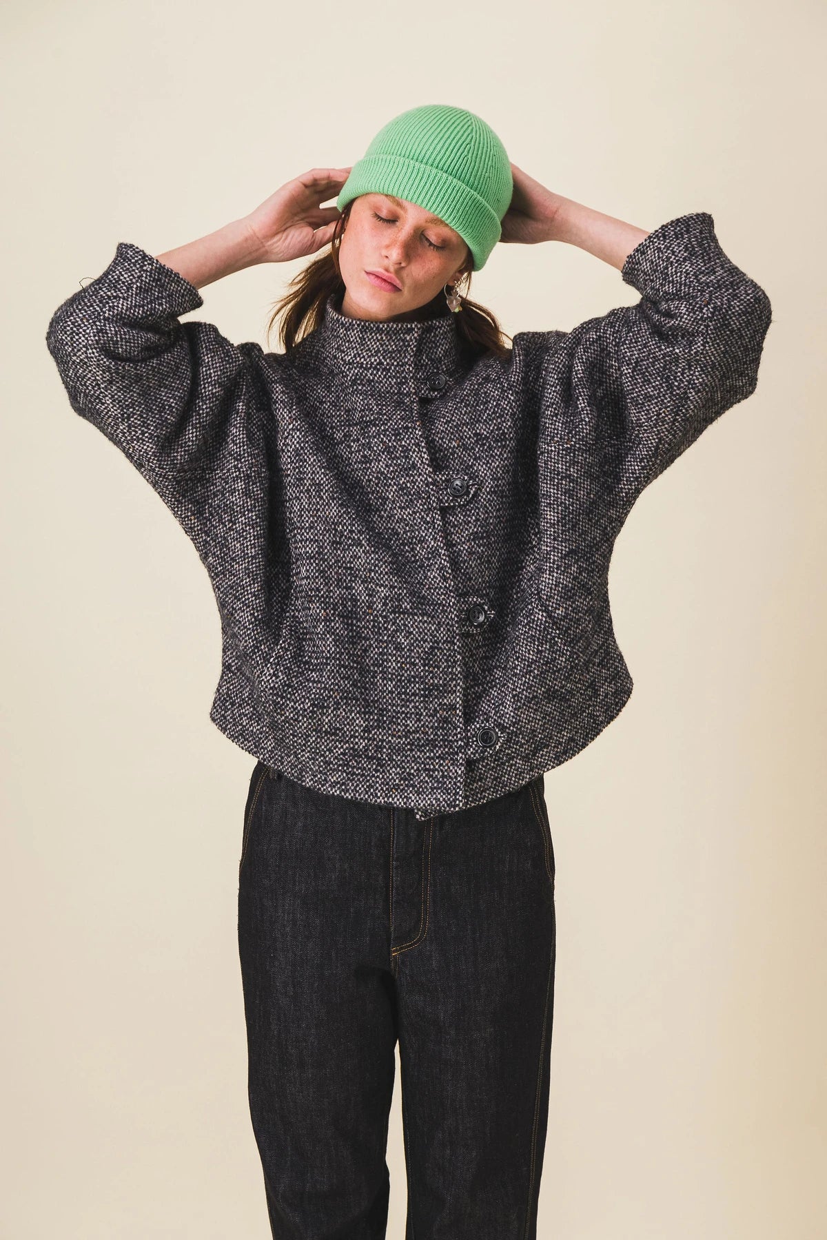 Chaqueta corta de lana para mujer con cierre de correas abotonadas, cuello alto y mangas murciélago.