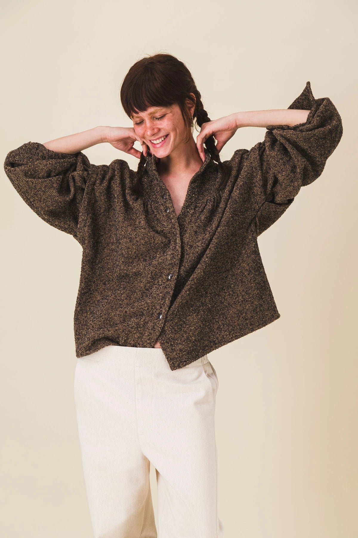Blusa de cuello redondo en lana marrón, sobrecamisa auténtica de lana italiana jaspeada marrón-beige, cierre de presión en la parte delantera.