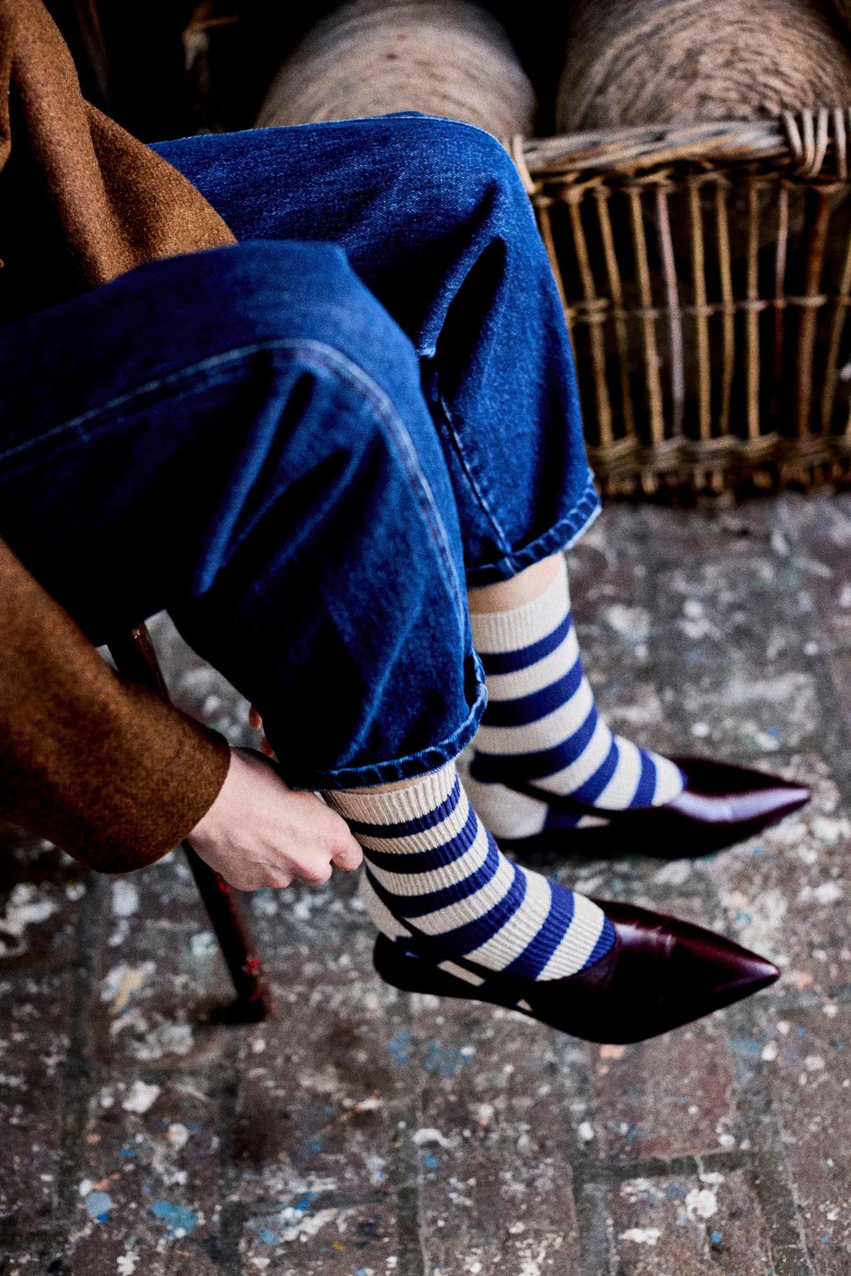 Calcetines de mujer a rayas con bandas anchas de color azul y crudo brillante.