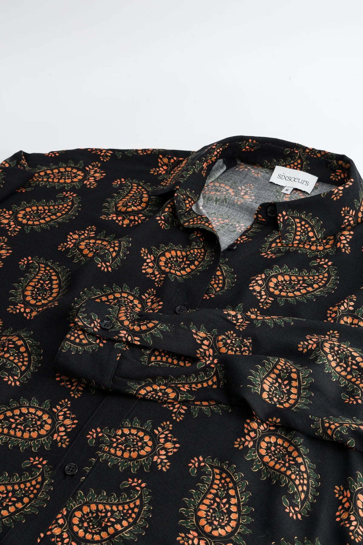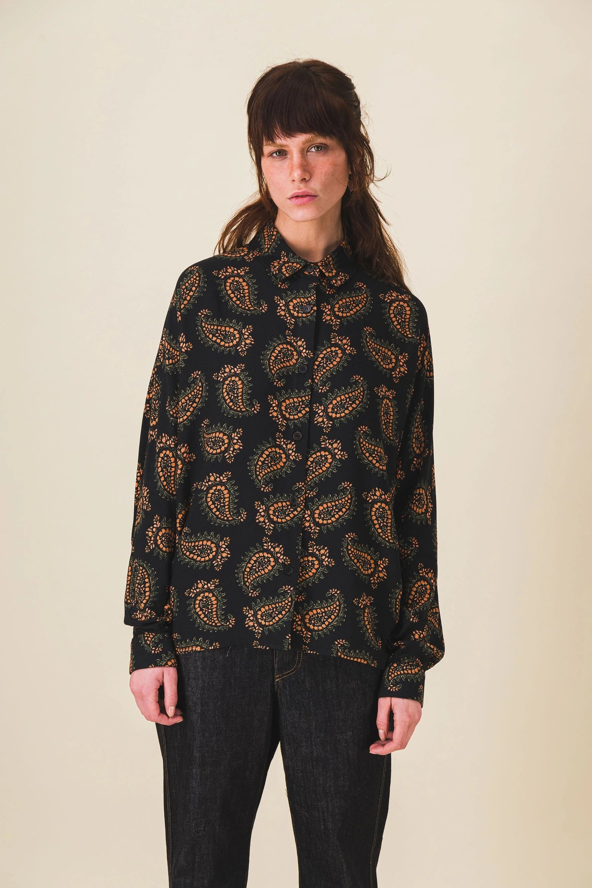 Camisa de mujer negra con estampado Paisley en tonos verdes y naranjas, corte recto pero fluido (material viscosa).