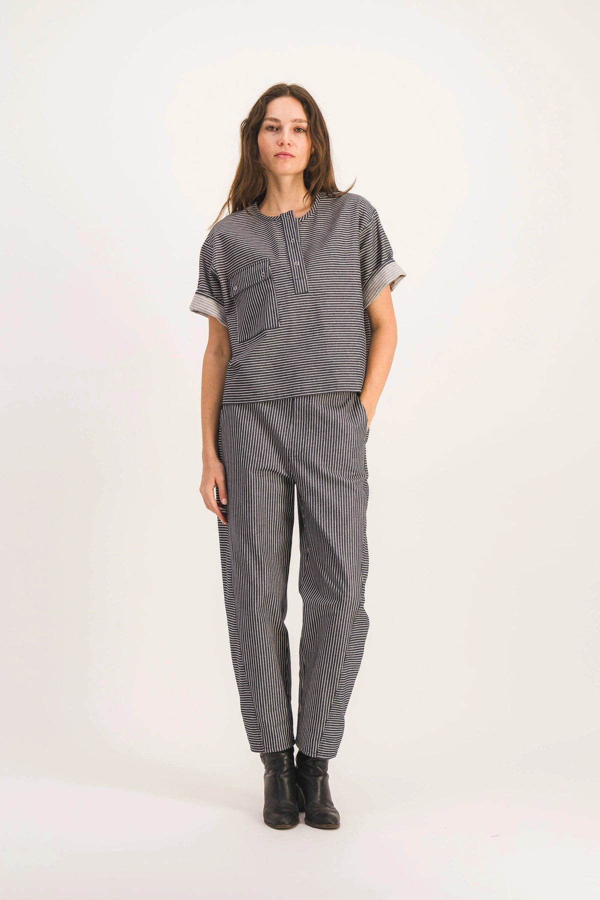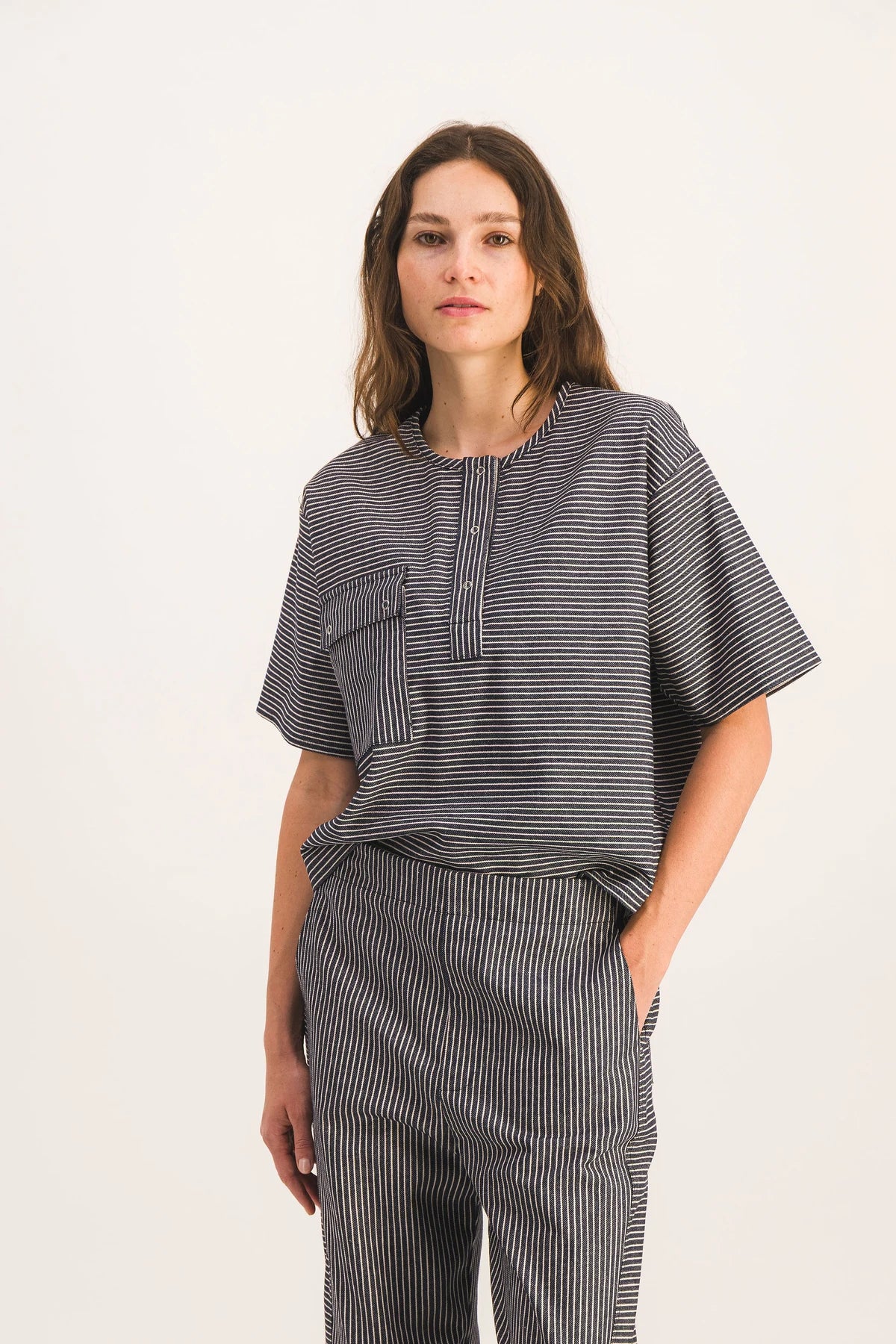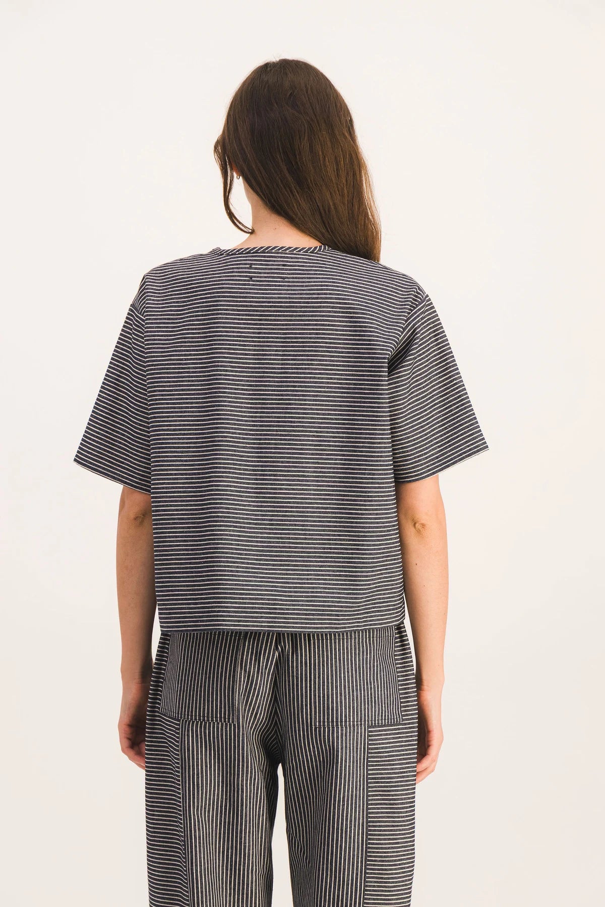 Top de manga corta de rayas azul marino y crudo.