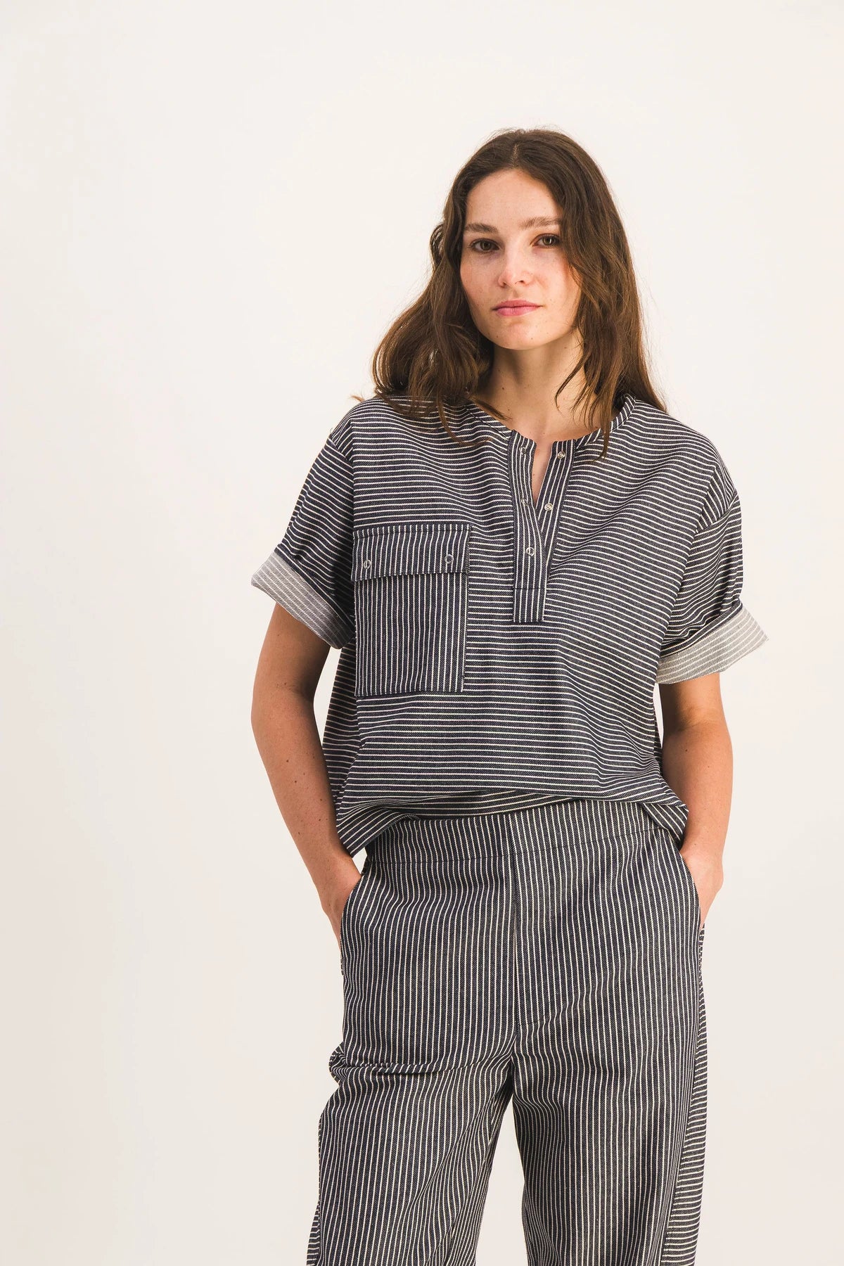 Tejido: 44 % algodón orgánico, 37 % algodón reciclado, 14 % poliéster reciclado, 5 % otras fibras. Fabricado en Francia.